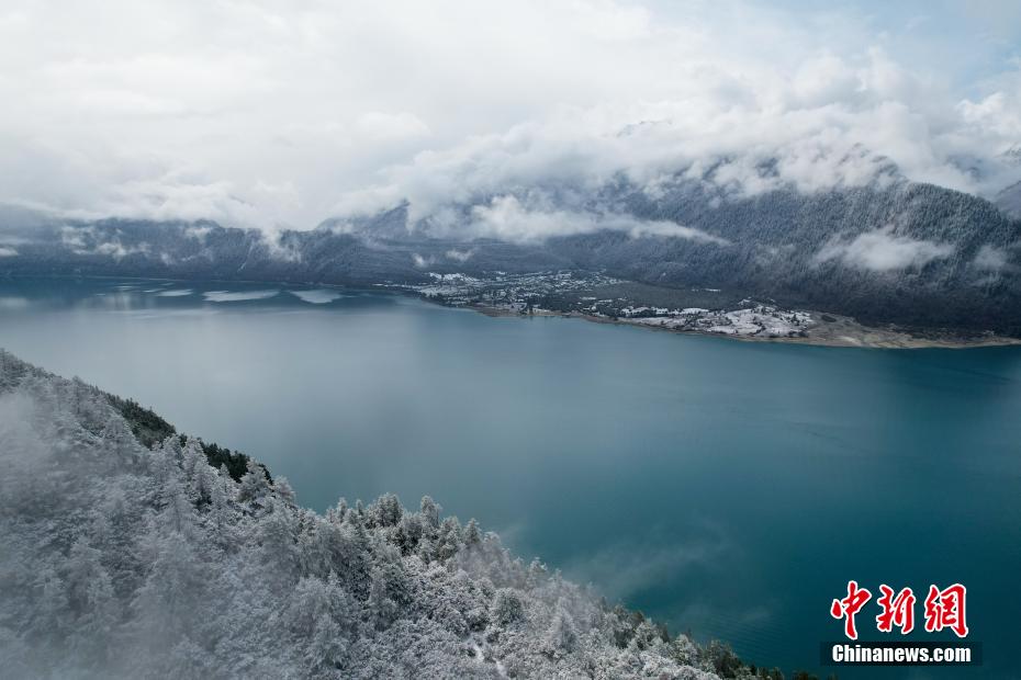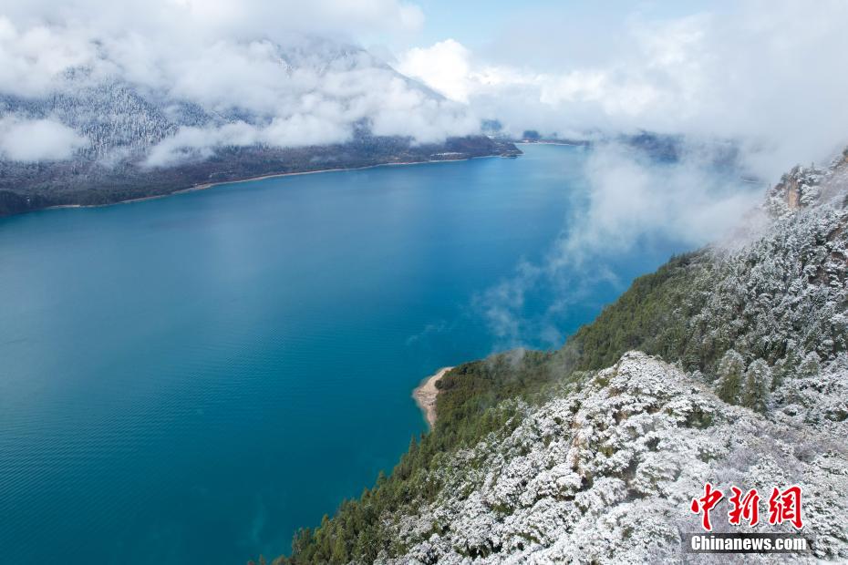 巴松錯位于西藏林芝工布江達縣境內,地處巴河上游的高山峽谷中,是西藏首個自然風景類國家5A級旅游景區(qū)。4月5日,巴松錯迎來一場春雪,雪后四周原始森林猶如蒙上潔白面紗,湖面宛如一面藍寶石鑲嵌其中,風光如畫。圖為4月5日,春雪后的巴松錯風光。(無人機畫面)中新社記者 江飛波 攝