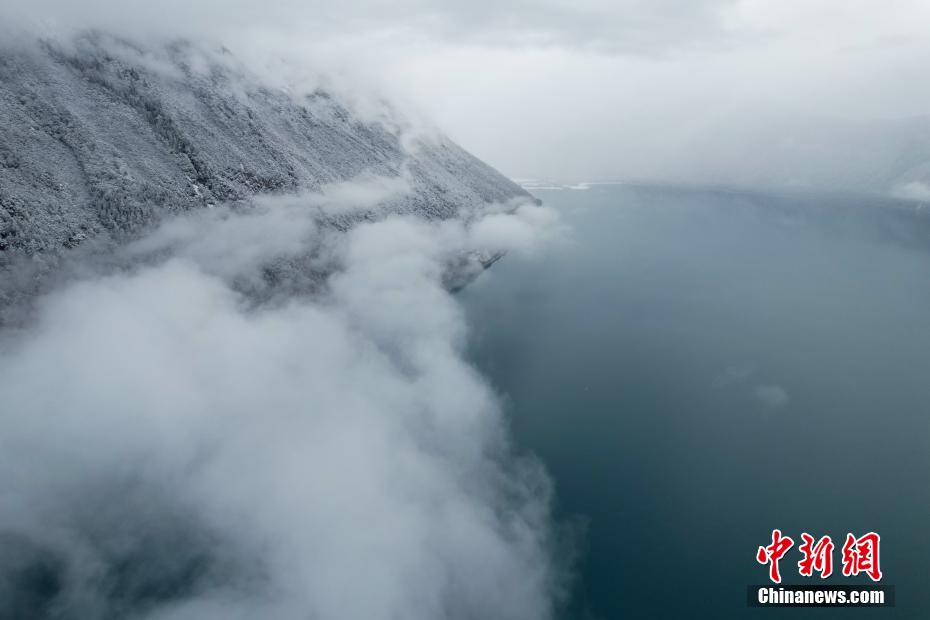 巴松錯位于西藏林芝工布江達縣境內,地處巴河上游的高山峽谷中,是西藏首個自然風景類國家5A級旅游景區(qū)。4月5日,巴松錯迎來一場春雪,雪后四周原始森林猶如蒙上潔白面紗,湖面宛如一面藍寶石鑲嵌其中,風光如畫。圖為4月5日,雪后巴松錯四周云霧繚繞,猶如仙境。(無人機畫面)中新社記者 江飛波 攝