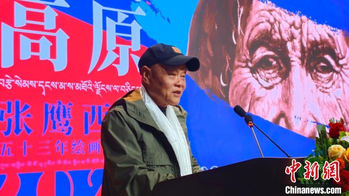 圖為張鷹在繪畫展開幕式上講述他與西藏情緣。貢桑拉姆 攝
