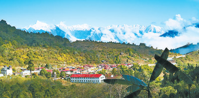 格林村與遠(yuǎn)處的雪山、近處的森林共同構(gòu)成一幅生態(tài)畫(huà)卷。黃家斌攝