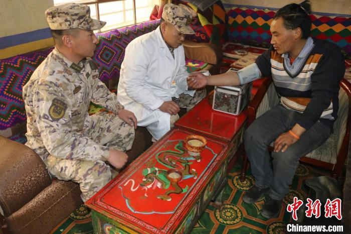 圖為官兵為牧民測量血壓。裴志鵬 攝