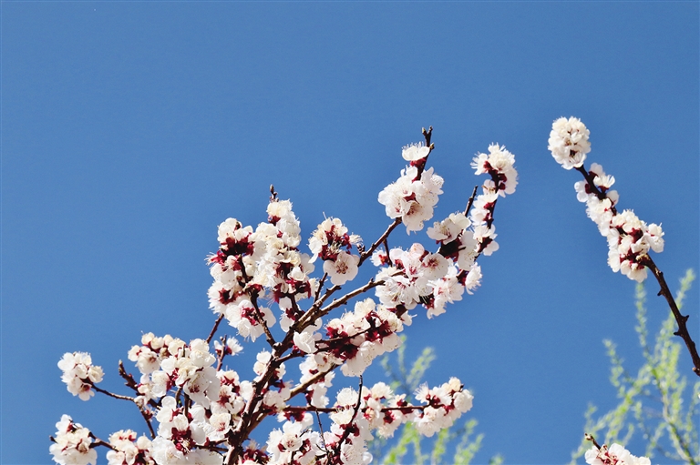 路邊的榆葉梅率先吐蕊,粉白的花朵簇?fù)碓谥︻^,遠(yuǎn)看如粉白的云朵飄浮在街道兩側(cè)。沿著道路慢慢走,幾株桃樹(shù)穿插在其中,深紅淺粉交錯(cuò),以藍(lán)天為背景,舉起手機(jī)隨手一拍都是高清壁紙級(jí)別的美景。陽(yáng)光正好時(shí),能看到在花樹(shù)下曬太陽(yáng)的老奶奶,她們?yōu)檫@浪漫的春日景色增添了一絲生活的氣息。