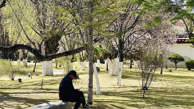 在拉薩,賞花從不必刻意尋找景區(qū),許多街道便藏著盎然春色。四月的拉薩城西,也有著令人目不暇接的美好。八一路、羅堆西路、羅布林卡路一帶,除了常見(jiàn)的榆葉梅、紫葉李等,還藏著拉薩不常見(jiàn)的海棠花,此時(shí)的海棠花在綠葉的襯托下開(kāi)得正艷。陽(yáng)光灑下,花朵和葉子的顏色飽和度極高,微風(fēng)拂過(guò),花瓣輕柔飄落,不少路人紛紛停下拍照,將明艷的春色收進(jìn)自己的手機(jī)。