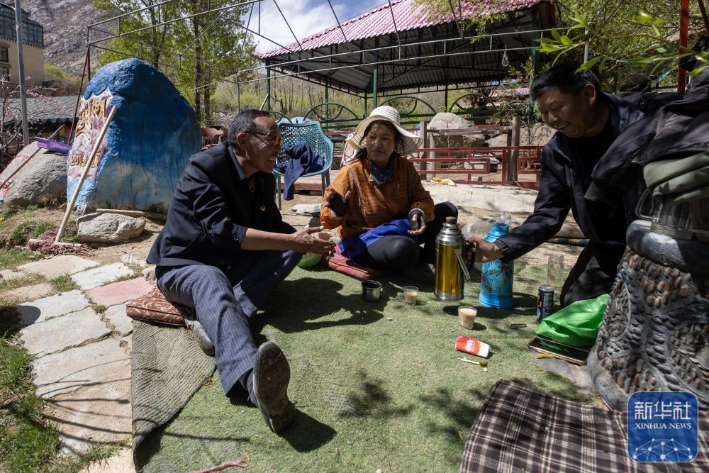 尼瑪(左)在村里與一家農(nóng)家樂(lè)的經(jīng)營(yíng)者交談(4月24日攝)。