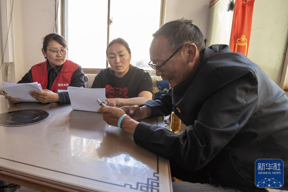 尼瑪(右)在村委會(huì)與村干部交流工作(4月24日攝)。
