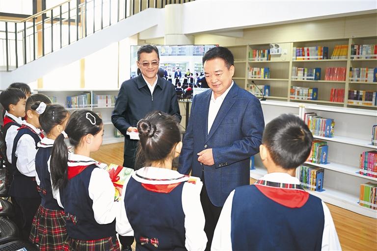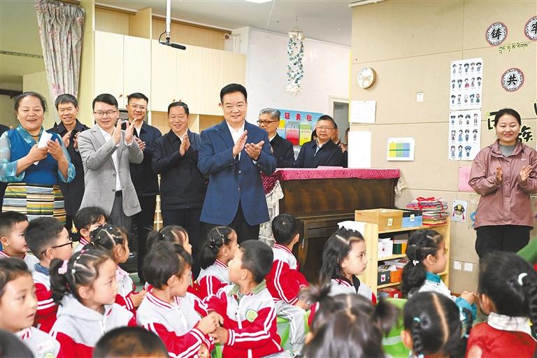 初夏,萬(wàn)物并秀,生機(jī)勃發(fā),拉薩市實(shí)驗(yàn)小學(xué)書(shū)聲瑯瑯。王君正走進(jìn)校園,察看學(xué)校環(huán)境,參觀自然、閱讀、書(shū)法、體育等教育成果展示,了解學(xué)校歷史沿革、建設(shè)發(fā)展、教育教學(xué)等情況。他指出,習(xí)近平總書(shū)記高度重視、親切關(guān)懷少年兒童和少先隊(duì)工作,多次參加少先隊(duì)活動(dòng),發(fā)表重要講話、作出重要指示。5月27日,習(xí)近平總書(shū)記致信祝賀中國(guó)少年先鋒隊(duì)第九次全國(guó)代表大會(huì)召開(kāi),殷切寄語(yǔ)廣大少年兒童,飽含著對(duì)大家的深切關(guān)愛(ài)。要加強(qiáng)愛(ài)國(guó)主義教育,講好思政課,著力講好黨的故事、革命的故事、英雄的故事,時(shí)刻把祖國(guó)和人民放在心中,不忘初心、童心向黨,從小聽(tīng)黨話、感黨恩、跟黨走;要積極推廣國(guó)家通用語(yǔ)言文字,把鑄牢中華民族共同體意識(shí)根植少年兒童心靈深處,引導(dǎo)他們爭(zhēng)做民族團(tuán)結(jié)的小石榴籽,爭(zhēng)當(dāng)學(xué)習(xí)和踐行社會(huì)主義核心價(jià)值觀的小模范。圖書(shū)館內(nèi),“紅領(lǐng)巾小書(shū)蟲(chóng)”讀書(shū)分享活動(dòng)正在進(jìn)行,孩子們圍坐在一起,與定日縣長(zhǎng)所鄉(xiāng)完全小學(xué)學(xué)生視頻連線,共同分享喜歡的書(shū)籍,王君正認(rèn)真傾聽(tīng)、親切詢問(wèn),向孩子們贈(zèng)送書(shū)籍?!白鎳?guó)的未來(lái)和希望在你們身上,要熱愛(ài)祖國(guó)、好好學(xué)習(xí)、天天向上,從小培養(yǎng)良好的道德情操?!蓖蹙膭?lì)他們說(shuō),要多讀書(shū)、讀好書(shū),從書(shū)中汲取智慧和營(yíng)養(yǎng),將來(lái)做對(duì)國(guó)家、對(duì)人民、對(duì)社會(huì)有用的人。