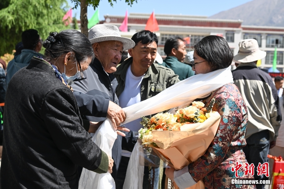 6月9日上午11時30分,西藏自治區(qū)2025年普通高考完成所有科目考試。圖為家長在拉薩市拉薩中學(xué)考點外為結(jié)束考試的孩子獻鮮花。中新社記者 李林 攝