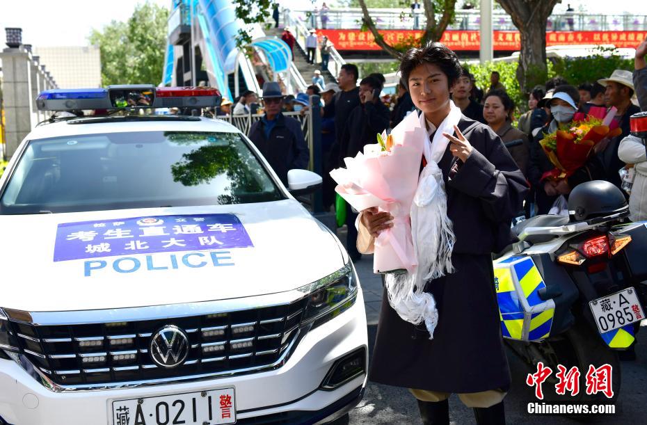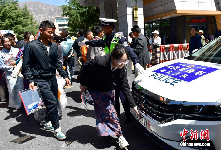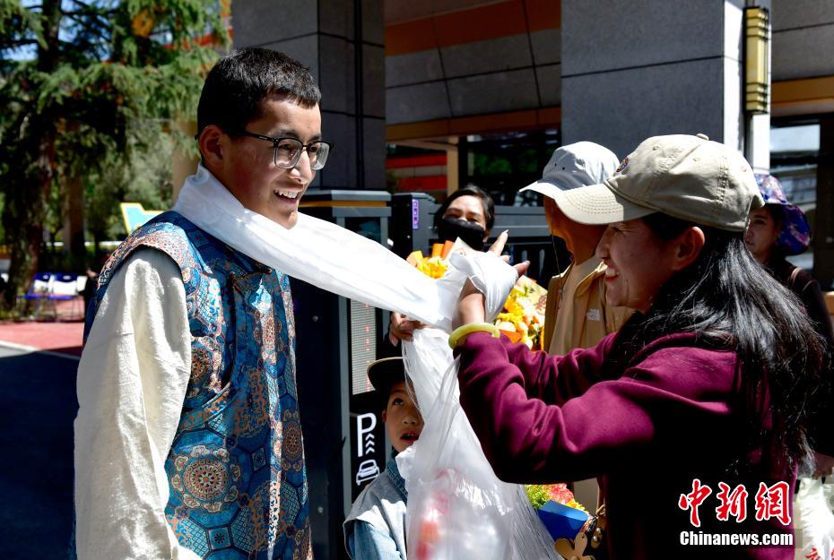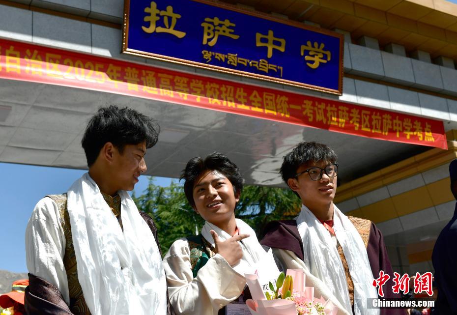 6月9日,西藏拉薩江蘇實驗中學(xué)考點外親友為考生送上哈達。當日,西藏自治區(qū)2025年普通高考完成所有科目考試,2025年西藏高考落下帷幕。中新社記者 貢嘎來松 攝