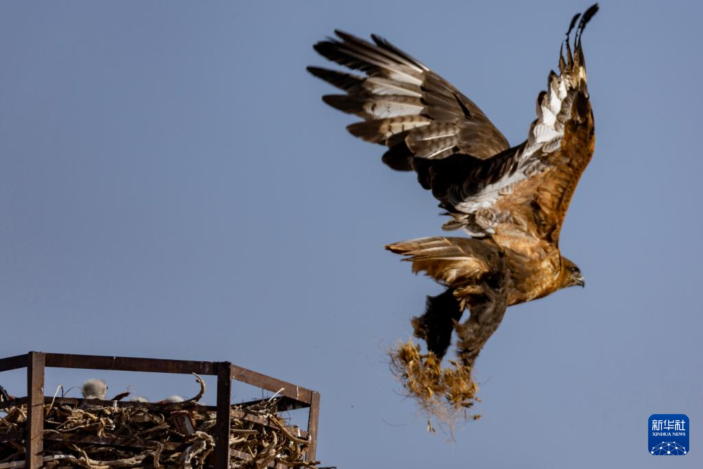 羌塘草原上的一只大鵟飛離鷹架上的巢(6月8日攝)。新華社記者 孫瑞博 攝