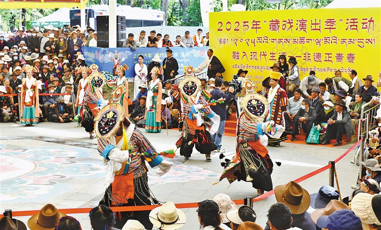 6月13日,以“融入現(xiàn)代生活——非遺正青春”為主題的2025年“藏戲演出季”活動(dòng)在拉薩市宗角祿康公園舉行。本次活動(dòng)由非遺體驗(yàn)、產(chǎn)品展銷、藏戲展演三個(gè)部分組成,精彩的表演吸引了眾多市民游客觀看。圖為活動(dòng)現(xiàn)場(chǎng),拉薩市堆龍德慶區(qū)措麥藏戲隊(duì)帶來的藏戲劇目《智美更登》。記者 旦增蘭澤 攝