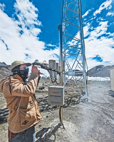安多縣的氣象裝備保障人員在格拉丹東自動(dòng)氣象站開(kāi)展維護(hù)保障工作。安多縣氣象局供圖