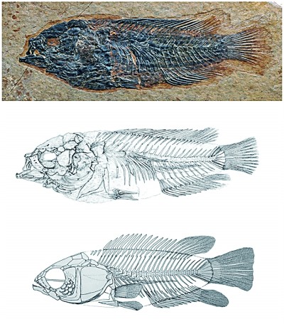 西藏始攀鱸化石(上),吳飛翔繪素描圖(中)及骨骼復原圖(下)