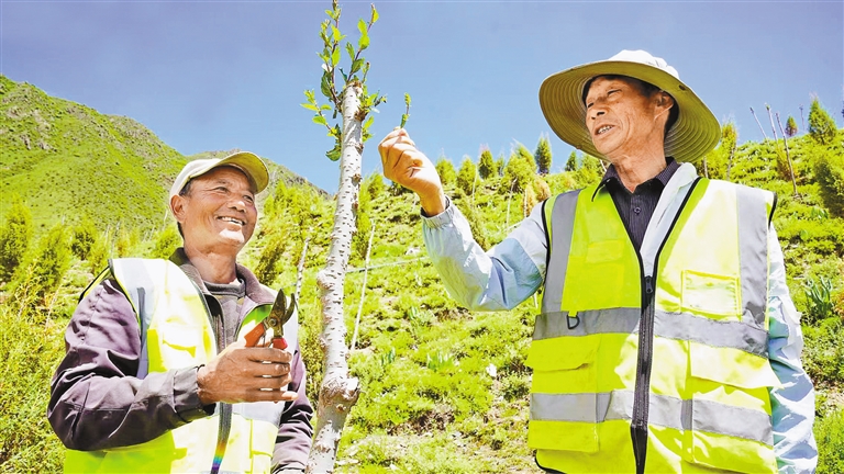 在2號(hào)片區(qū),一支特殊養(yǎng)護(hù)隊(duì)伍映入眼簾。十幾位藏族村民在技術(shù)員的指導(dǎo)下修剪枝條,掌握技術(shù)后將成為專業(yè)管護(hù)人員。村民的動(dòng)作略顯生疏,但專注的神情流露出對(duì)樹(shù)苗的珍視。