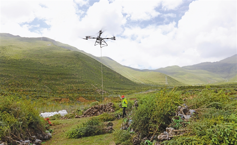 南北山綠化工程墨竹工卡縣段11號(hào)片區(qū)無(wú)人機(jī)在運(yùn)送苗木。