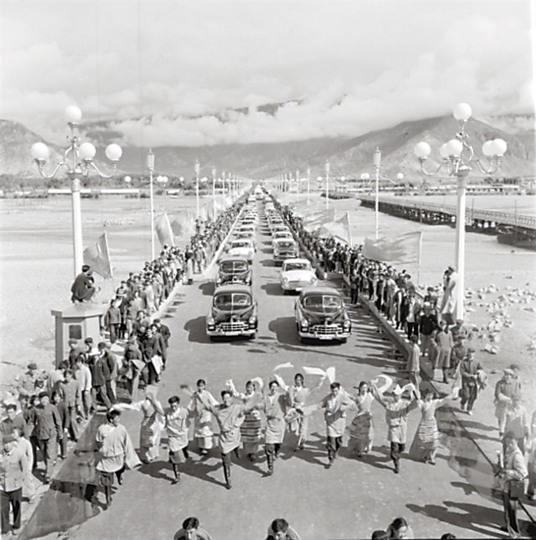1965年拉薩大橋建成通行時(shí)的場景(資料圖片)。