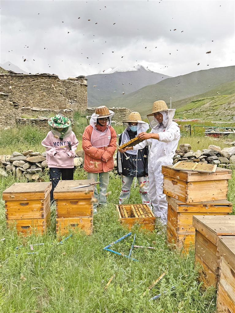 “蜂”產(chǎn)業(yè)激活鄉(xiāng)村振興“甜蜜動能”。走進卡珠村的德康瓦蜜蜂養(yǎng)殖專業(yè)合作社養(yǎng)殖基地,一排排蜂箱整齊擺放,成群的蜜蜂穿梭在花叢間,振翅的嗡嗡聲交織成一曲熱鬧的豐收曲。負(fù)責(zé)人尼瑪桑旦,一位返鄉(xiāng)創(chuàng)業(yè)的95后大學(xué)生,正帶領(lǐng)員工們忙碌著:“我們創(chuàng)立了‘阿媽準(zhǔn)’藏蜜品牌,也在銷售風(fēng)干牛肉、人參果、蕁麻草等特色產(chǎn)品,通過電商平臺,我們的‘哲古味’已經(jīng)賣到了全國。去年銷售額突破了115萬元,還帶動了周邊10多戶群眾增收致富?!边@間小小的加工坊,正是哲古鎮(zhèn)推動傳統(tǒng)產(chǎn)業(yè)與現(xiàn)代市場接軌的生動縮影。