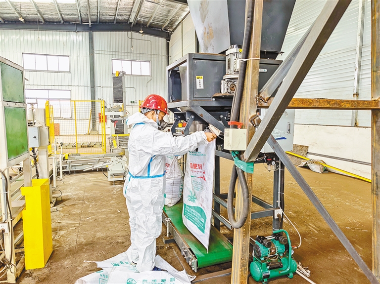 圖為在措美縣哲古社區(qū)有機肥加工廠,工人正把調(diào)配好的有機肥裝袋。通訊員 王利軍 攝