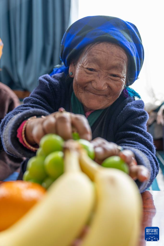 7月17日,拉珍老人在三有村幸福驛站日間照料室里吃水果。新華社記者 旦增尼瑪曲珠 攝