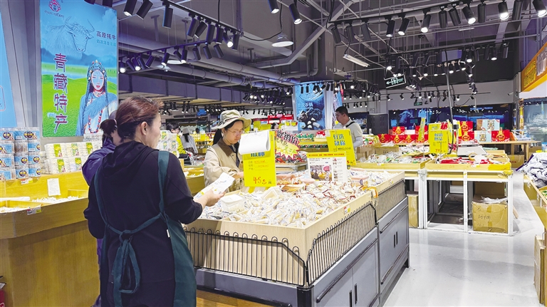 除了家電賣場,特產(chǎn)超市也迎來了消費熱潮。在位于拉薩市濱河路乃倉廣場負一樓的藏匯倉·西藏特產(chǎn)倉儲超市(乃倉總店),前來選購特產(chǎn)的消費者絡(luò)繹不絕,貨架前時常排起長隊。該超市負責人李紅容笑著說:“今年上半年的客流量和銷售額都比去年同期上漲了不少,像牦牛肉干、藏香、青稞制品這些特色產(chǎn)品特別受歡迎。一方面是本地市民買回去自己吃或者送給外地朋友;另一方面很多游客也會專門過來采購,把西藏的味道帶回去。現(xiàn)在物流方便,我們還開通了快遞直發(fā)服務,不少消費者在線上下單,店里的線上訂單量每個月都在增加。為了滿足消費者需求,我們還增加了產(chǎn)品種類,光是青稞制品就有青稞餅干、青稞麥片、青稞酒等二十多個品種?!?/p>