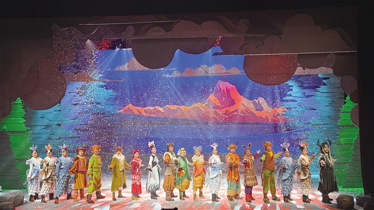 在《高原上的精靈》舞臺上,西藏傳統(tǒng)樂器的韻律與生態(tài)寓言相互交織。當(dāng)弦子、鷹笛和扎念琴的聲音劃破夜空時(shí),小觀眾們已沉浸其中。藏戲溫巴的藍(lán)面具在聚光燈下浮現(xiàn),藏戲特有的說唱調(diào)式如雪山融水般流淌……《高原上的精靈》以80分鐘的音樂劇形式突破傳統(tǒng)話劇的敘事框架,這種形式選擇源于深刻的兒童心理洞察——音樂劇特有的歌舞敘事能持續(xù)刺激視覺與聽覺神經(jīng),避免低齡觀眾對純對白場景產(chǎn)生倦怠感。