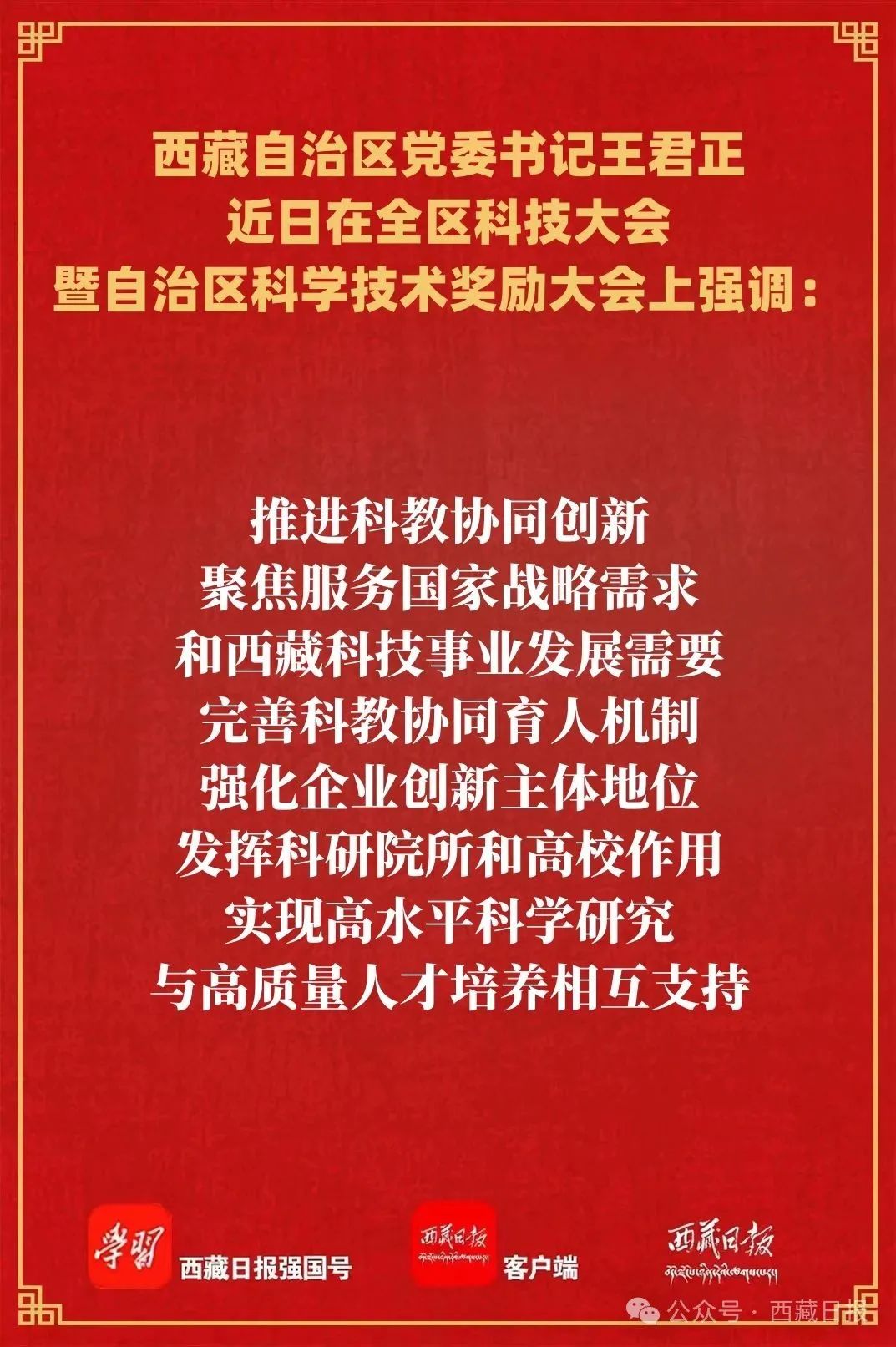 王君正代表自治區(qū)黨委、政府,向全體獲獎人員和單位表示祝賀,向廣大科技工作者為西藏長治久安和高質(zhì)量發(fā)展作出的積極貢獻致以崇高敬意和衷心感謝。他指出,黨的十八大以來,以習(xí)近平同志為核心的黨中央高度重視科技事業(yè)發(fā)展,習(xí)近平總書記從黨和國家發(fā)展戰(zhàn)略全局的高度,對科技創(chuàng)新進行頂層謀劃和系統(tǒng)部署,有力推進科技自立自強,我國科技事業(yè)取得歷史性成就、發(fā)生歷史性變革。2024年6月,習(xí)近平總書記在全國科技大會、國家科學(xué)技術(shù)獎勵大會、兩院院士大會上發(fā)表重要講話,為做好新時代科技工作進一步指明了前進方向、提供了根本遵循。全區(qū)各級各部門要認(rèn)真貫徹落實習(xí)近平總書記重要指示精神,深刻認(rèn)識科技創(chuàng)新是推動經(jīng)濟高質(zhì)量發(fā)展的核心動力、是實現(xiàn)人民高品質(zhì)生活的現(xiàn)實需要、是建設(shè)社會主義現(xiàn)代化新西藏的戰(zhàn)略支撐,進一步增強責(zé)任感使命感緊迫感,加快推進科技創(chuàng)新,為推動西藏長治久安和高質(zhì)量發(fā)展作出新貢獻。