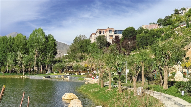 拉薩團(tuán)結(jié)公園坐落于布達(dá)拉宮西麓、藥王山腳下。昔日,這里房屋高低錯(cuò)雜、線纜交錯(cuò)密布、市場(chǎng)喧鬧擁擠、環(huán)境喧囂擾攘,不僅影響城市形象和生態(tài)環(huán)境,還影響出行游玩體驗(yàn)。如今,湖水如碧綢般清澈,岸邊綠樹成蔭,各類花卉競(jìng)相綻放,昔日雜亂之地已蛻變?yōu)轸浯涿髦?,人文古跡與自然景致相映成趣,共同繪就出“百澤繞城·水城相依”的生態(tài)文明畫卷。