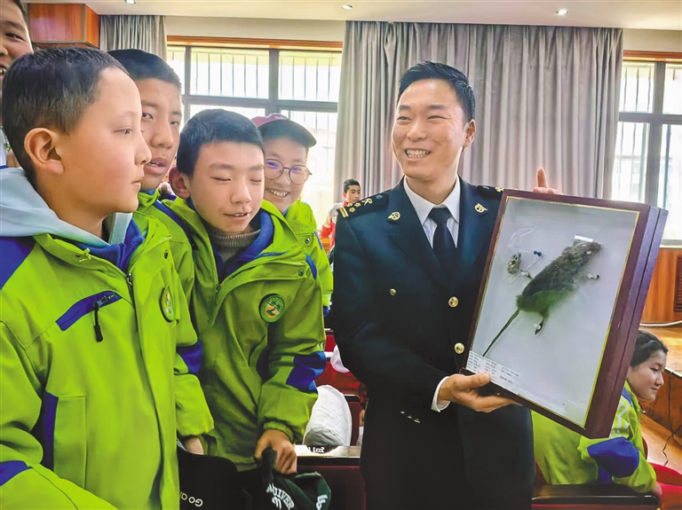 “同學(xué)們,這個(gè)圓柱形的赤褐色小蟲子,大家知道是什么嗎?它可是木材的‘隱形殺手’……”近期,在拉薩市第七中學(xué)課堂上,海關(guān)關(guān)員通過(guò)實(shí)物標(biāo)本展示,向120余名師生生動(dòng)講解檢疫性有害生物雙鉤異翅長(zhǎng)蠹的危害?;顒?dòng)現(xiàn)場(chǎng),海關(guān)關(guān)員通過(guò)展示外來(lái)入侵物種標(biāo)本、講解“異寵”及外來(lái)物種入侵危害知識(shí),幫助同學(xué)們了解《中華人民共和國(guó)生物安全法》等相關(guān)法律法規(guī),引導(dǎo)青少年樹立生物安全意識(shí),積極守護(hù)生態(tài)安全。