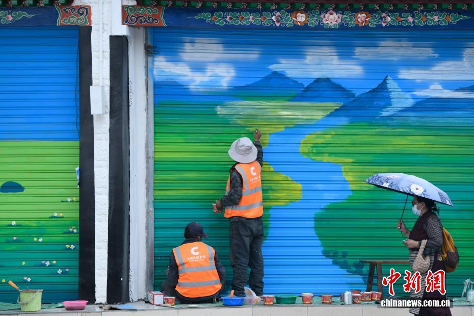 圖為工人在卷閘門上彩繪西藏的山水風(fēng)景。中新社記者 貢嘎來松 攝