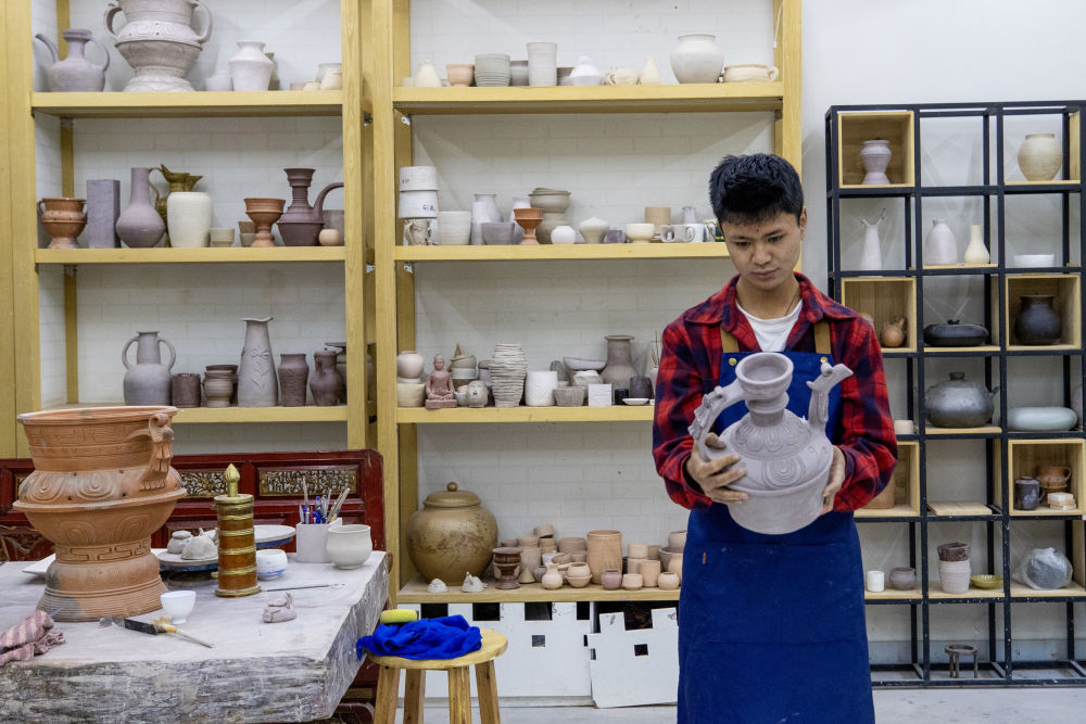 8月6日,一名制陶師在制作陶器。藏族傳統(tǒng)泥陶雕塑制作技藝入選西藏自治區(qū)級非物質(zhì)文化遺產(chǎn)代表性項目名錄。