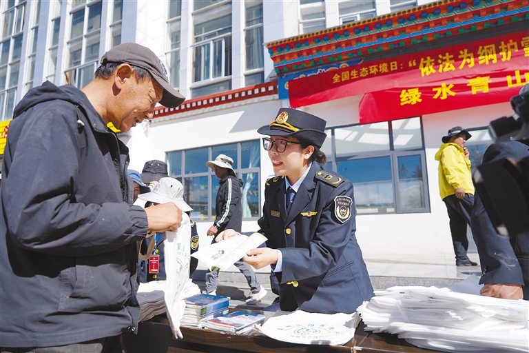 在法規(guī)宣講環(huán)節(jié),工作人員通過設(shè)立宣傳展板、懸掛宣傳橫幅、發(fā)放政策法規(guī)手冊、現(xiàn)場接受群眾咨詢答疑等形式,向群眾集中宣傳《中華人民共和國青藏高原生態(tài)保護(hù)法》及自治區(qū)實施辦法等生態(tài)環(huán)保法律法規(guī)。