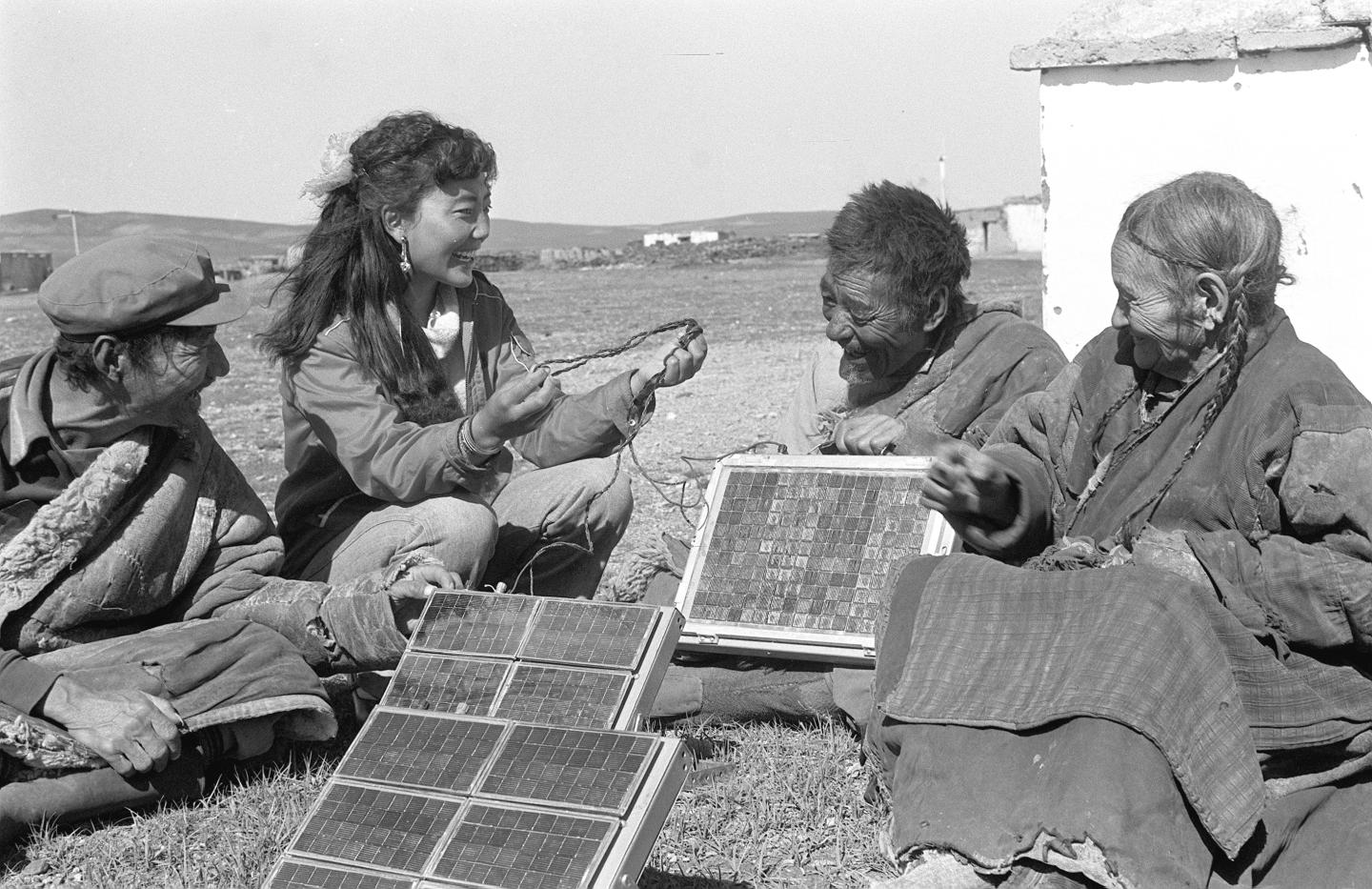 1986年3月,那曲地區(qū)(現為那曲市)科委工作人員齊美才央(左二)給牧民講解太陽能電池使用方法。新華社記者 才龍 攝