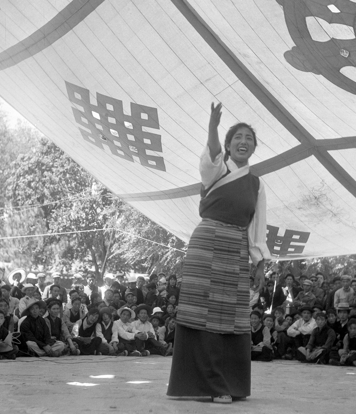 1965年10月,在西藏拉薩各族各界群眾慶祝自治區(qū)成立聯歡會上,西藏文化工作隊隊員雍西在演出。新華社記者 林楓 攝