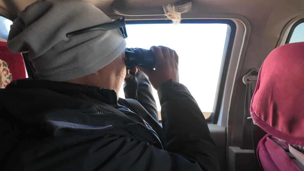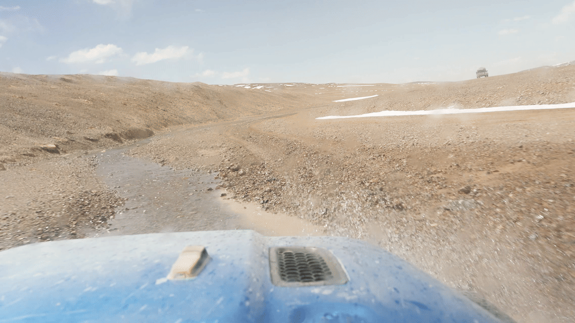 為了拍下野保員的日常工作以及藏羚羊大遷徙的宏大場(chǎng)面,我們一行跟隨巡護(hù)車,向著保護(hù)區(qū)核心區(qū)進(jìn)發(fā)。路面逐漸從“蜿蜒崎嶇的溪流”變成“波濤洶涌的大?!保揭败噧?nèi)好像一個(gè)迪斯科舞池,每一件東西都像被賦予了生命一般蹦蹦跳跳,伴隨著我們這些乘客的驚呼,連同引擎的轟鳴一起,揉碎在無(wú)邊荒原的呼嘯風(fēng)聲中。