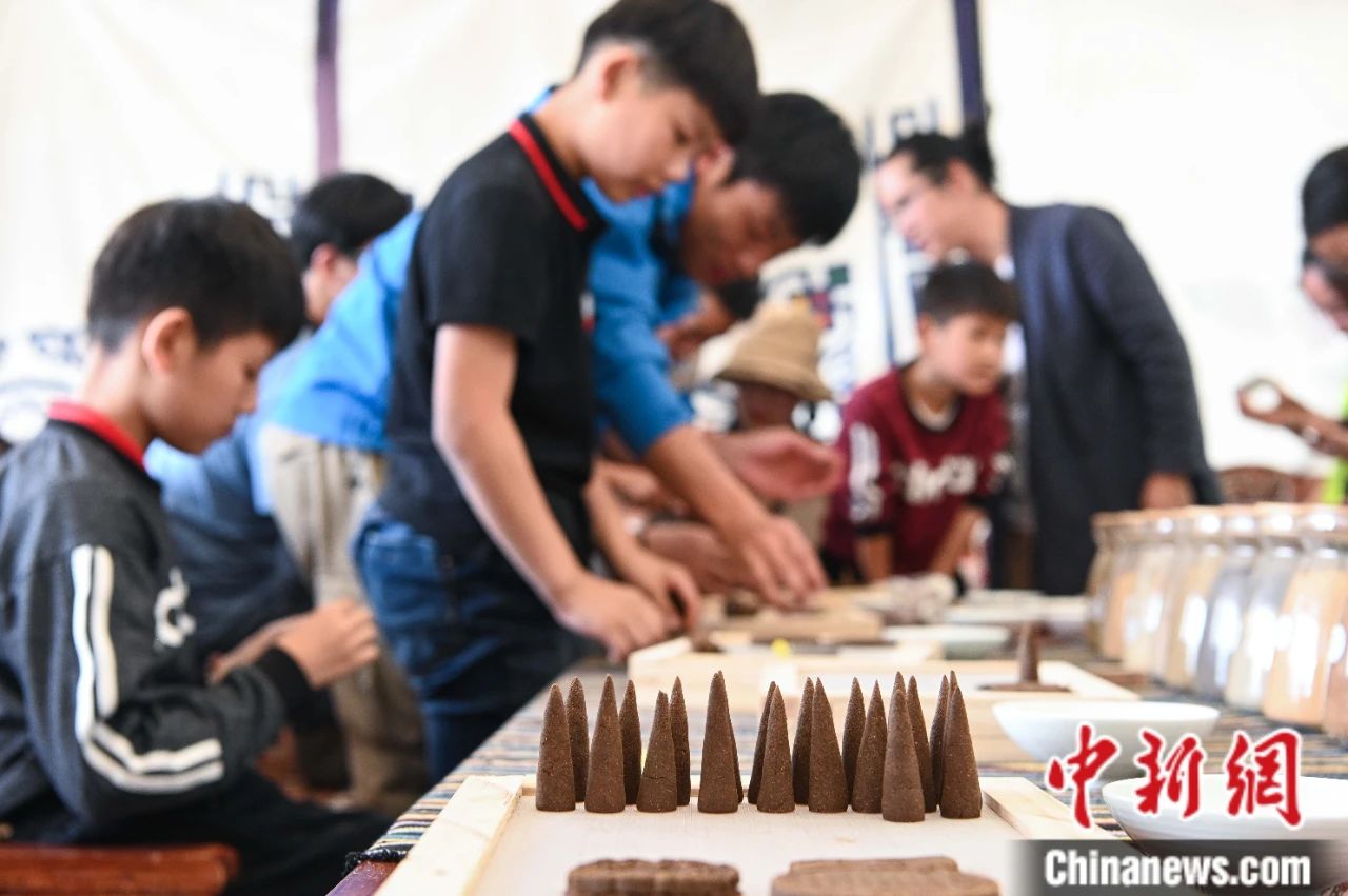圖為2019年7月6日,來(lái)自江蘇蘇州的小游客們?cè)诘录丶殷w驗(yàn)藏香手作。中新社記者 何蓬磊 攝