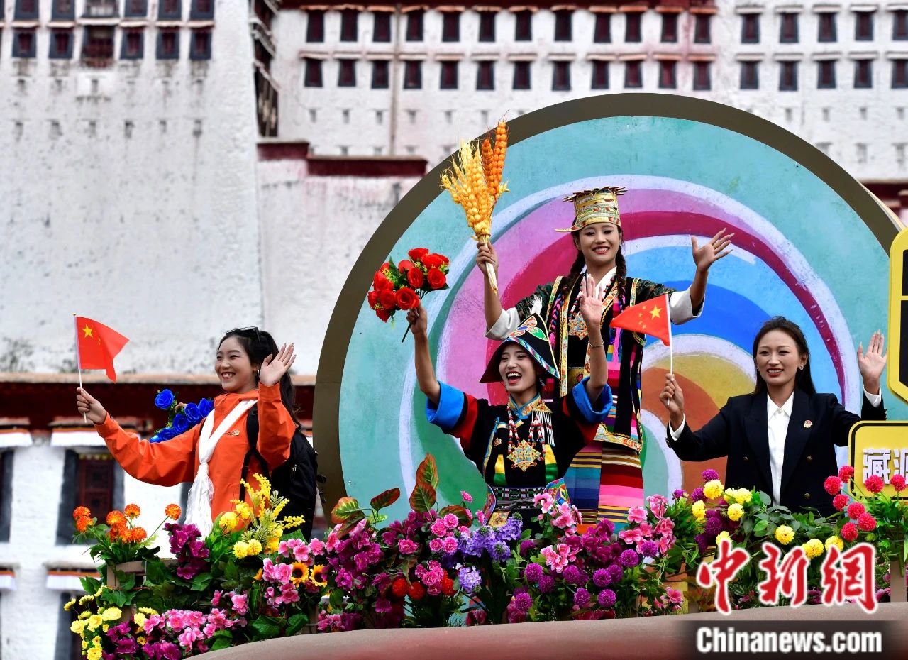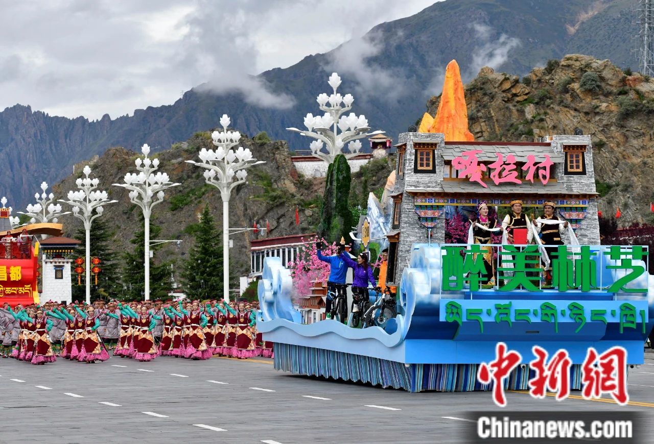 圖為西藏自治區(qū)成立60周年慶祝大會(huì)中的林芝彩車(chē)方隊(duì)。中新社記者 李林 攝