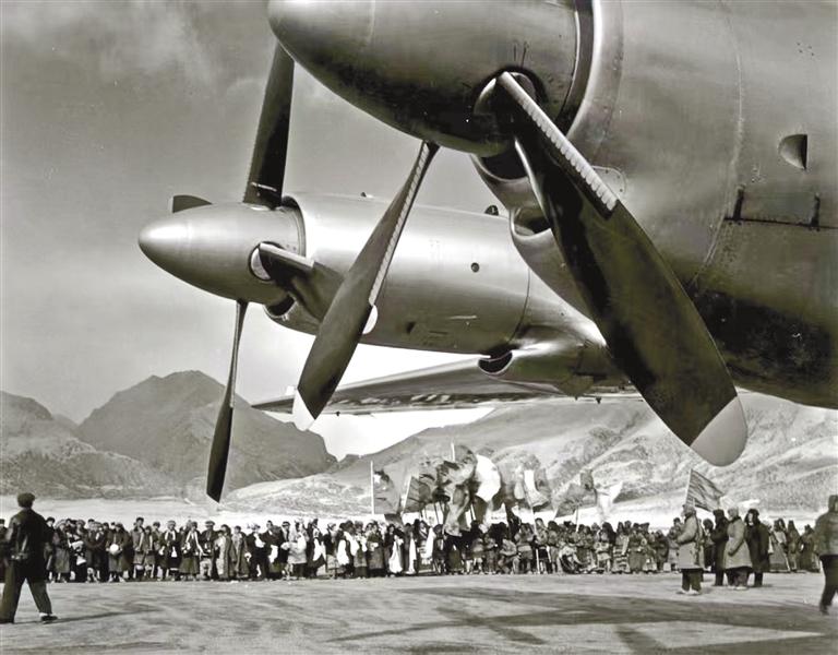 無畏開拓,筑起雪域天路。1955年底,黨中央、國務(wù)院作出開辟北京至拉薩民用航線的重要指示。1956年4月26日,當(dāng)雄草原上建起了簡易跑道;5月26日,韓琳機(jī)組駕駛伊爾-12型飛機(jī)從北線試航,穿破層層云障,成功降落在雪山環(huán)抱的當(dāng)雄機(jī)場,填補(bǔ)了我國高高原飛行的空白;9月5日,歷時(shí)118天,西藏第一座機(jī)場——當(dāng)雄機(jī)場建成。此后的10年間,多次組織試飛。1965年3月1日,民航第一飛行大隊(duì)孫權(quán)貴和畢春芳機(jī)組駕駛伊爾-18型飛機(jī)從北京起飛,次日平穩(wěn)降落當(dāng)雄機(jī)場,北京-成都-拉薩航線正式通航,西藏民航波瀾壯闊的發(fā)展篇章就此開啟。