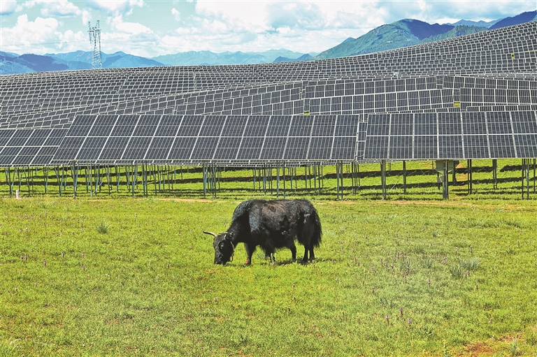 熱瓦鄉(xiāng)熱熱村是典型的牧業(yè)村,位于那曲市索縣的群山峻嶺之間。2023年12月,西藏開投集團投資建設(shè)的50MW牧光互補儲能項目在這里并網(wǎng)發(fā)電,遠遠望去像是山坡上的“藍色湖泊”。牧民們每天會趕著羊群來這里放牧,陽光透過光伏板的縫隙灑在草地上,羊群在陰涼下自由覓食。在光伏板的“庇護”下,不僅山地植被可以免受烈日大風(fēng)的侵襲,還能對養(yǎng)殖的動物起到保護效果,在充分利用光能優(yōu)勢的同時,為鄉(xiāng)村振興注入新動能,實現(xiàn)企業(yè)和農(nóng)牧民雙向受益。