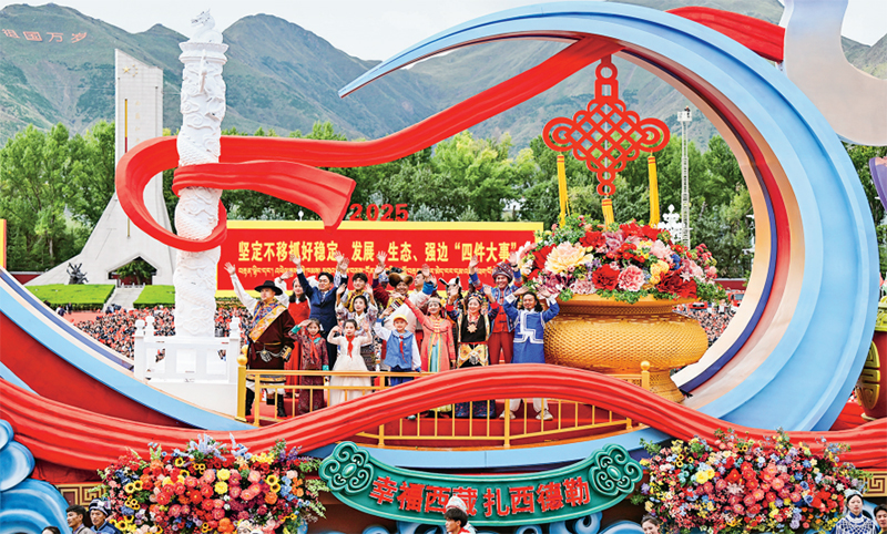 2025年8月21日上午,西藏各族各界干部群眾約2萬人歡聚拉薩市布達拉宮廣場,熱烈慶祝西藏自治區(qū)成立60周年。圖為游行的彩車通過布達拉宮廣場。 新華社記者 謝環(huán)馳/攝