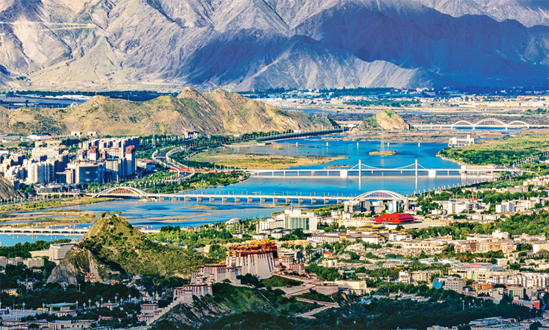 西藏自治區(qū)成立60年來,社會生產(chǎn)力獲得極大解放和發(fā)展,社會面貌發(fā)生翻天覆地的變化。圖為2025年7月30日拍攝的拉薩河風(fēng)光,河上的橋由近及遠分別是連心橋、柳梧大橋、和美橋、青藏鐵路拉薩河特大橋,這些橋梁方便了人們的生活,扮靚了城市的風(fēng)景,也是西藏經(jīng)濟社會發(fā)展、交通基礎(chǔ)設(shè)施建設(shè)日新月異的側(cè)影。 新華社記者 姜帆/攝