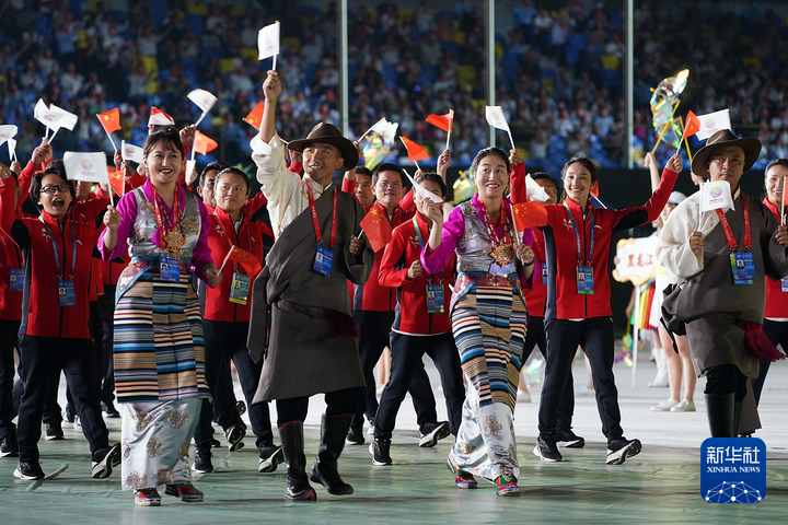 第十四屆全運會開幕式,西藏自治區(qū)體育代表團(tuán)在入場儀式上(2021年9月15日攝)。新華社記者 彭子洋 攝