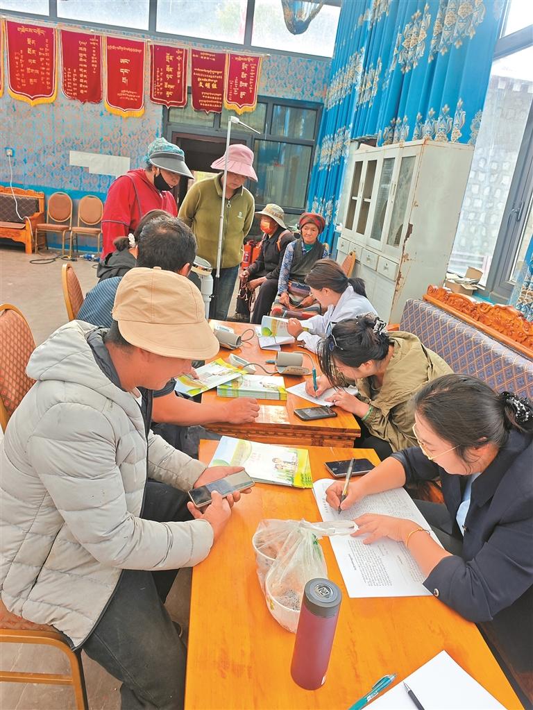 “五彩梅朵·曲水心橋”志愿服務(wù)隊(duì)耐心為村民組長講解政策。