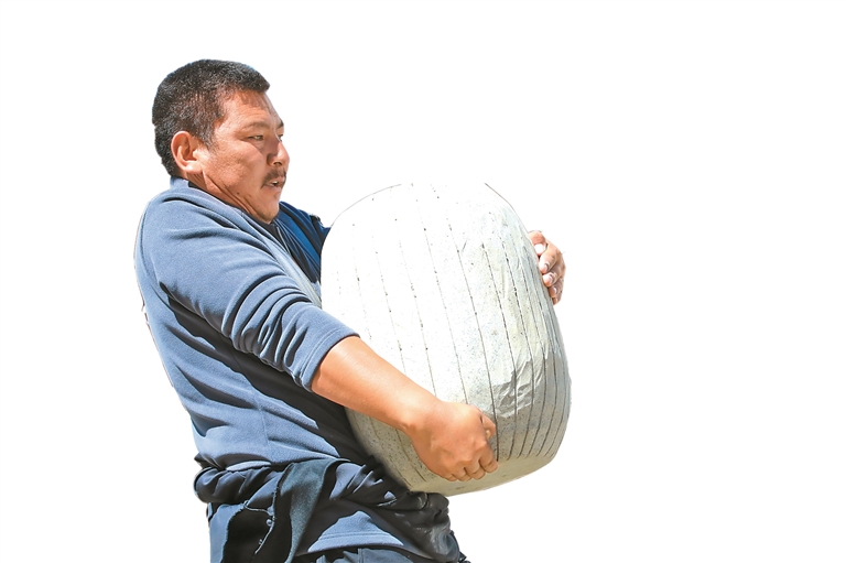 圖為參賽隊(duì)員全力抱起石頭,這是力量的完美展現(xiàn)。
