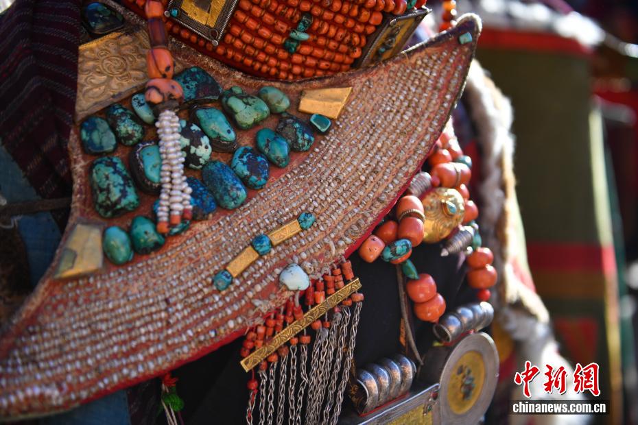 9月23日,西藏自治區(qū)阿里地區(qū)普蘭縣,至今保留著獨(dú)特的藏族服飾——普蘭服飾,它是中國(guó)國(guó)家級(jí)非物質(zhì)文化遺產(chǎn)。普蘭服飾已有1000多年的歷史,其中最精美、最獨(dú)特的是婦女的“孔雀服飾”,普蘭縣科迦村里有7戶人家保存著7套祖?zhèn)鞣?,一套重達(dá)20多公斤,裝飾有黃金、白銀、松石、瑪瑙、珊瑚、珍珠等,承載和沉淀了百年時(shí)光,堪稱“穿在身上的千年史”。時(shí)至今日,這種美麗的服飾文化還在當(dāng)?shù)貍鞒兄?。圖為普蘭服飾細(xì)節(jié)展示。貢確 攝