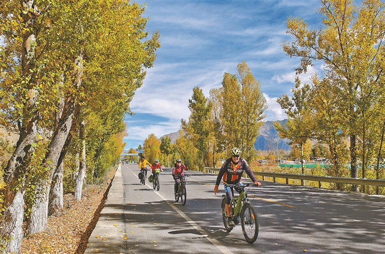 走出城區(qū),曲水縣與墨竹工卡縣的田園秋色漸次展開(kāi),大地流金。蜿蜒的公路間偶有自行車(chē)隊(duì)穿行,人影掠過(guò),為寧?kù)o的秋日注入躍動(dòng)的氣息。