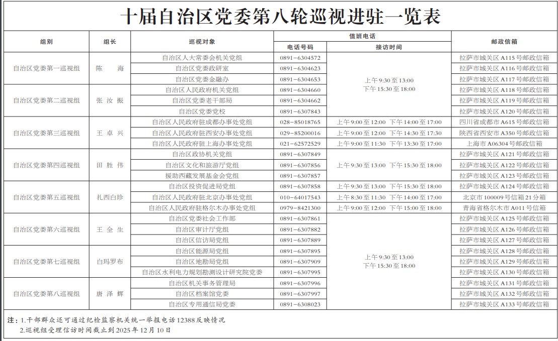 根據(jù)自治區(qū)黨委關(guān)于巡視工作的統(tǒng)一部署,截至10月24日,十屆自治區(qū)黨委第八輪巡視完成進(jìn)駐工作。自治區(qū)黨委巡視組將對(duì)自治區(qū)人大常委會(huì)機(jī)關(guān)、政府機(jī)關(guān)、政協(xié)機(jī)關(guān),自治區(qū)黨委社會(huì)工作部、政研室、金融辦、老干部局、機(jī)關(guān)事務(wù)管理局、黨校,自治區(qū)審計(jì)廳、信訪局、能源局、投資促進(jìn)局、地勘局、檔案館、專用通信局、水利電力規(guī)劃勘測(cè)設(shè)計(jì)研究院,自治區(qū)人民政府駐北京辦事處、駐成都辦事處、駐西安辦事處、駐上海辦事處、駐格爾木辦事處,援助西藏發(fā)展基金會(huì)等23個(gè)區(qū)直單位黨組織開(kāi)展常規(guī)巡視;對(duì)自治區(qū)文化和旅游廳黨組開(kāi)展巡視“回頭看”。