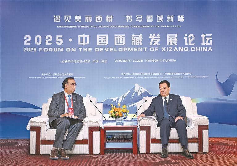10月28日,自治區(qū)黨委書(shū)記王君正在林芝會(huì)見(jiàn)參加2025·中國(guó)西藏發(fā)展論壇的外國(guó)政要和駐華使節(jié)。這是王君正會(huì)見(jiàn)聯(lián)合國(guó)秘書(shū)長(zhǎng)古特雷斯先生的代表,聯(lián)合國(guó)教科文組織駐華代表、東亞辦事處主任兼代表夏澤翰。本報(bào)記者 旦增西旦 攝