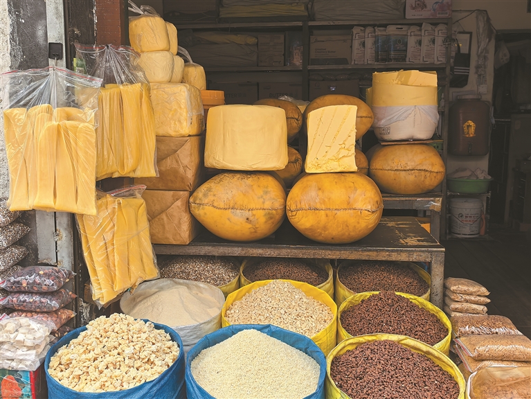 在八廓街,記者看到一家名為“奇寶酥油桶藏傳古玩店”的店鋪,店內(nèi)空間不大,卻擺放著滿滿當(dāng)當(dāng)?shù)摹皩氊悺薄魇礁鳂拥膫鹘y(tǒng)酥油桶、老式酥油茶壺、老式酸奶桶……像一座小小的主題博物館,展示著高原人民的勤勞與智慧。