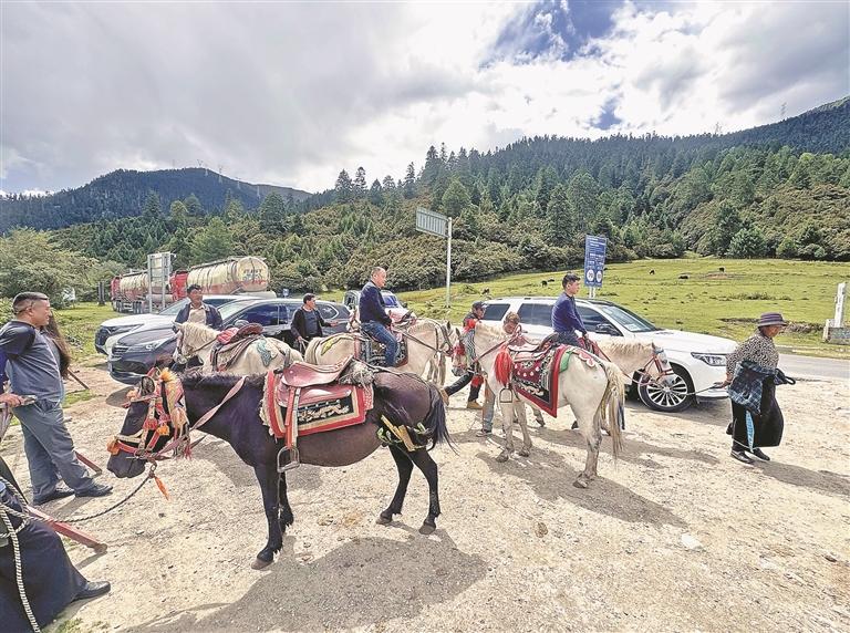 林芝市魯朗景區(qū)內(nèi),游客在體驗當?shù)靥厣T馬項目。 記者 白瑪澤旺 攝