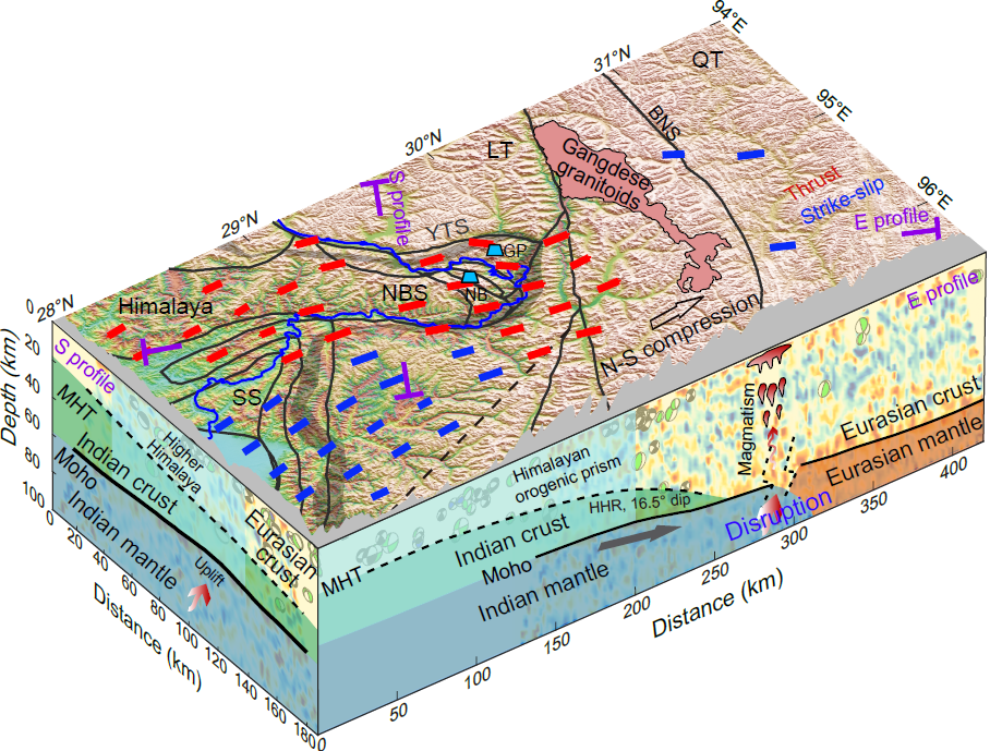 喜馬拉雅山脈由印度板塊與歐亞板塊碰撞形成,一段時期以來,科學家對其中段的地震機制已有較清晰認識,但對地質(zhì)構造更為復雜的東段仍了解有限。中國科學院青藏高原研究所一項研究首次揭示:印度板塊以低角度俯沖至青藏高原下方,并與特殊的“斜坡式”斷裂構造共同主導著喜馬拉雅東端的地震活動與地表隆升過程。該成果近日發(fā)表于學術期刊《國家科學評論》。