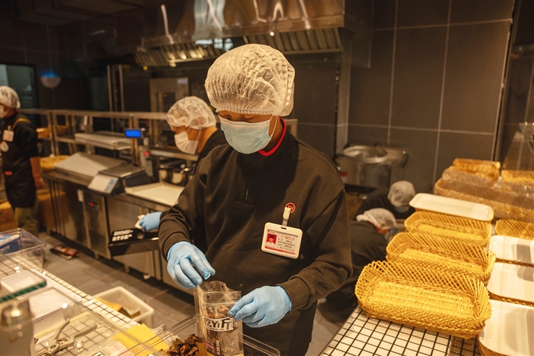 工作人員正在對牦牛肉干進(jìn)行裝袋。